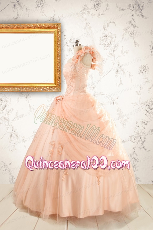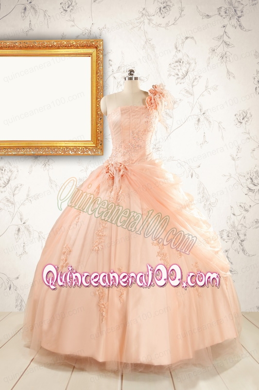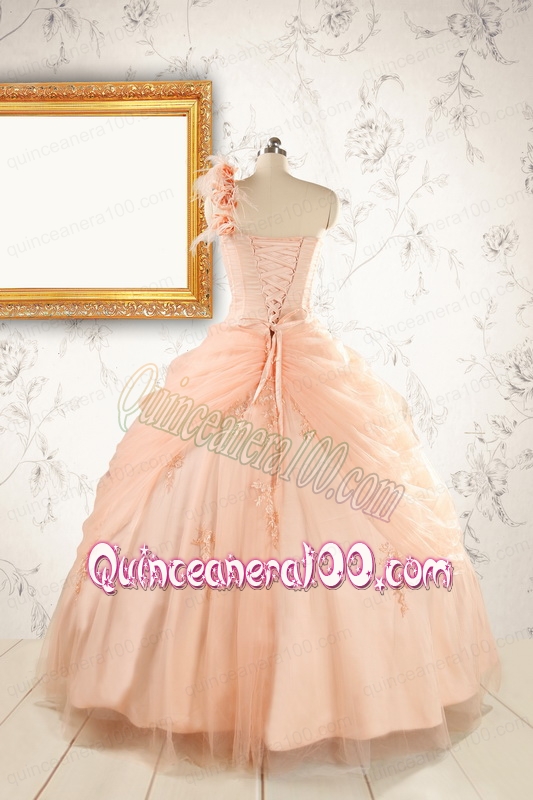 Neckline : One shoulderShown Color : PeachSilhouette : Ball GownsSleeve Length : sleevelessHemline : floor lengthBack Detail : Lace upFabric : TulleEmbellishment : Beading,Appliques,Hand Made FlowerOccasion : Prom,Party,Sweet 16Season : Spring,Summer,Fall