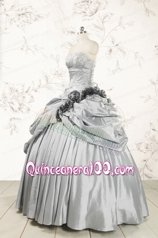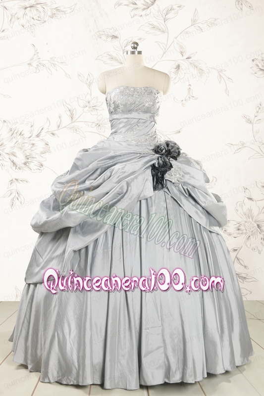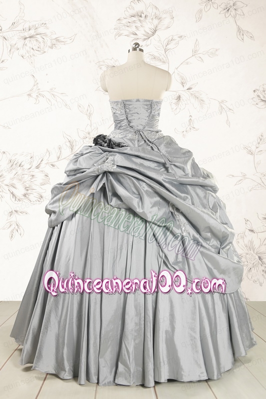 Neckline : StraplessShown Color : GreySilhouette : Ball GownsSleeve Length : sleevelessHemline : floor lengthBack Detail : Lace upFabric : TaffetaEmbellishment : Pick Ups,Hand Made FlowerOccasion : Prom,Military Ball,Sweet 16Season : Spring,Summer,Fall