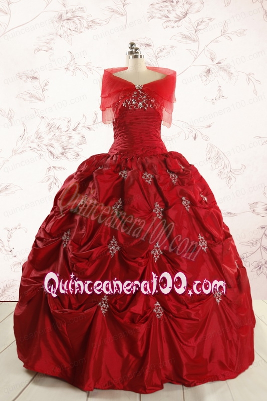 Neckline : StraplessShown Color : Wine RedSleeve Length : sleevelessHemline : floor lengthBack Detail : Lace upFabric : TaffetaEmbellishment : Appliques,Embroidery,Pick UpsOccasion : Prom,Military Ball,Sweet 16Season : Spring,Summer,Fall