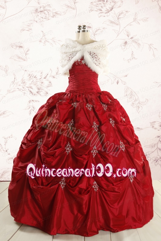Neckline : StraplessShown Color : Wine RedSilhouette : Ball GownsSleeve Length : sleevelessHemline : floor lengthBack Detail : Lace upFabric : TaffetaEmbellishment : Appliques,Pick UpsOccasion : Prom,Military Ball,Sweet 16Season : Spring,Summer,Fall