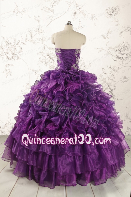 Neckline : StraplessShown Color : PurpleSilhouette : Ball GownsSleeve Length : sleevelessHemline : floor lengthBack Detail : Lace upFabric : OrganzaEmbellishment : Appliques,RufflesOccasion : Prom,Military Ball,Sweet 16Season : Spring,Summer,Fall