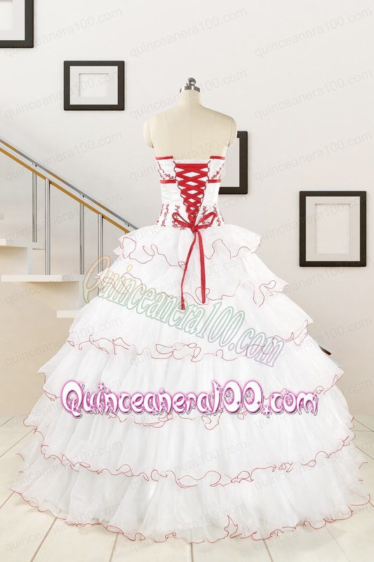 Neckline : StraplessShown Color : White And RedSilhouette : Ball GownsSleeve Length : sleevelessHemline : floor lengthBack Detail : Lace upFabric : OrganzaEmbellishment : Appliques,Ruffled LayersOccasion : Prom,Sweet 16Season : Spring,Summer,Fall