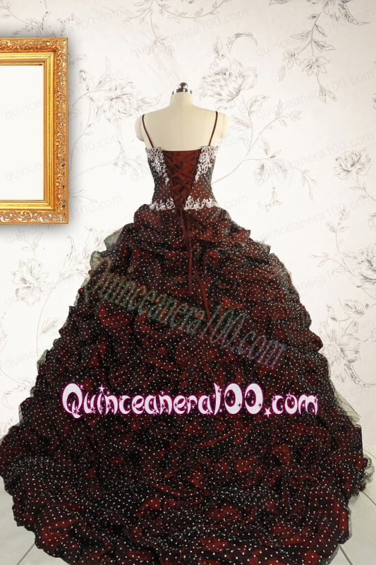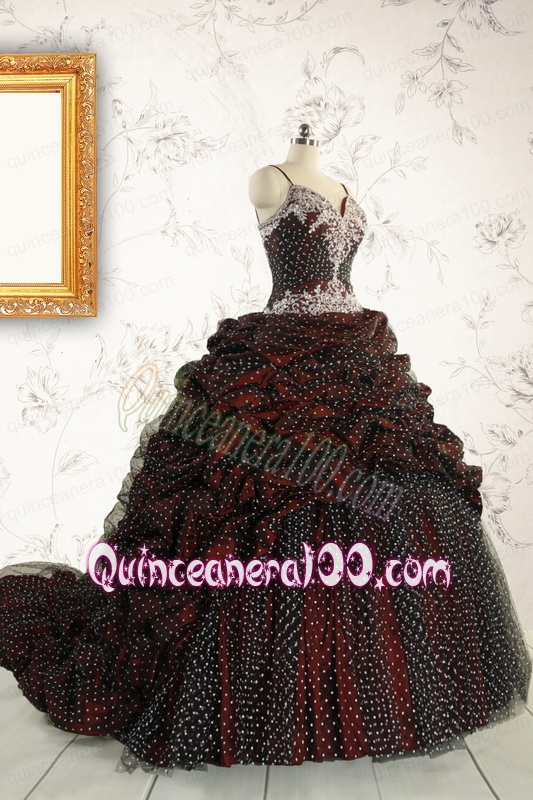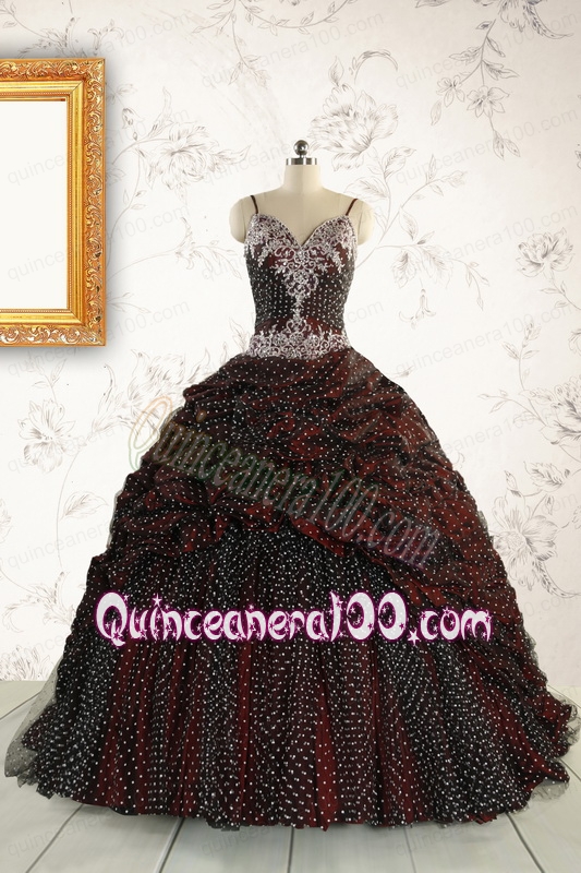 Neckline : Spaghetti strapsShown Color : BurgundySilhouette : Ball GownsSleeve Length : sleevelessHemline : floor lengthBack Detail : Lace upFabric : Taffeta,TulleEmbellishment : Appliques,Pick UpsOccasion : Prom,Military Ball,QuinceaneraSeason : Spring,Summer,Fall
