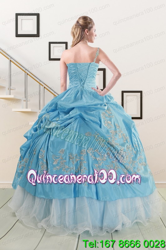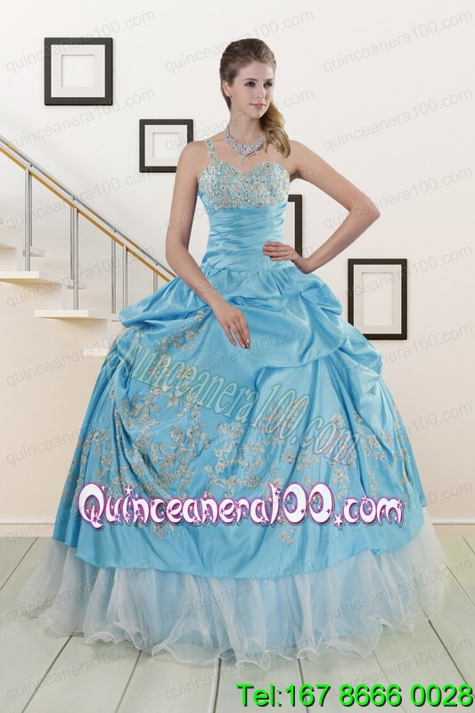 Neckline : One shoulder Shown Color : Aqua Blue Silhouette : Ball Gowns Sleeve Length : sleeveless Hemline : floor length Back Detail : Lace up Fabric : Taffeta Embellishment : Beading,Appliques Occasion : Military Ball,Sweet 16,Quinceanera Season : Spring,Summer,Fall,Winter