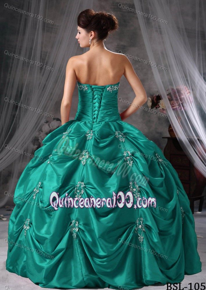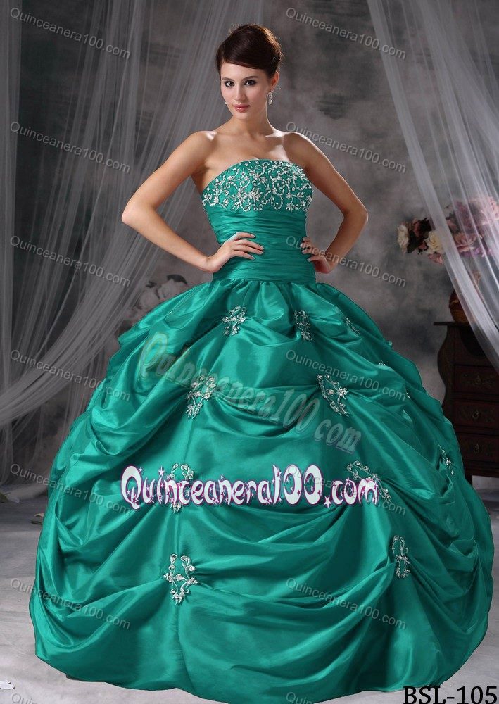 Neckline : StraplessShown Color : Aqua Blue,TurquoiseSilhouette : Ball GownsSleeve Length : sleevelessHemline : floor lengthBack Detail : Lace upFabric : TaffetaEmbellishment : Appliques,RuchingOccasion : Prom,Sweet 16,QuinceaneraSeason : Spring,Summer,Fall,Winter