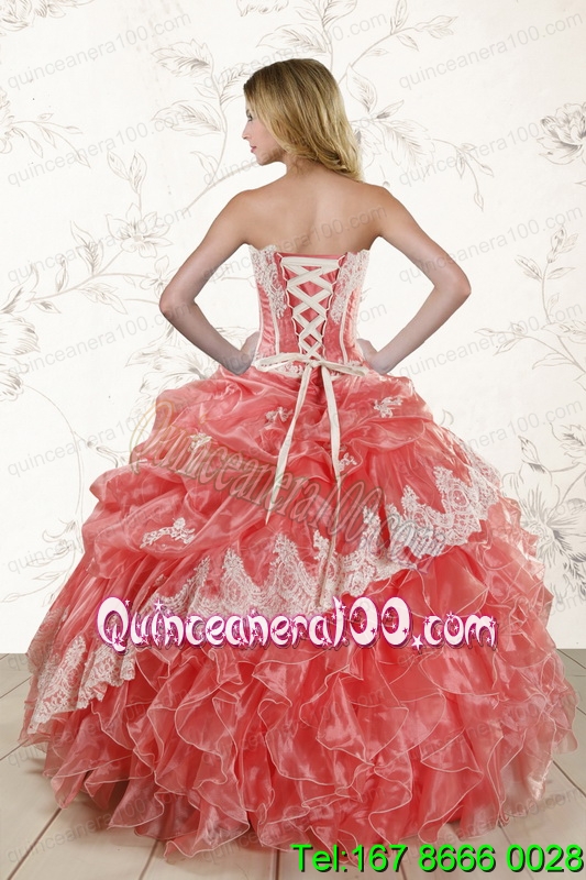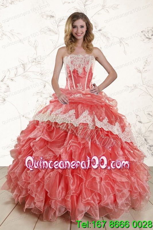 Neckline : StraplessShown Color : Watermelon RedSilhouette : Ball GownsSleeve Length : sleevelessHemline : floor lengthBack Detail : Lace upFabric : OrganzaEmbellishment : LaceOccasion : Military Ball,Sweet 16,QuinceaneraSeason : Spring,Summer,Fall,Winter