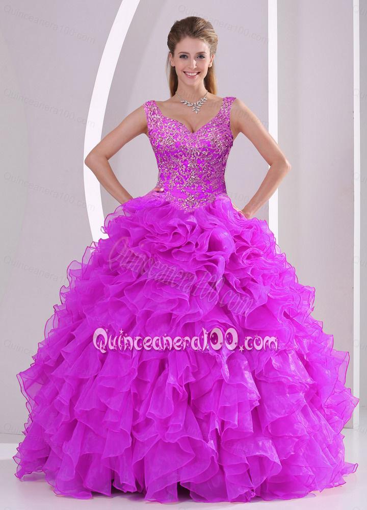 Neckline : V-neckShown Color : FuchsiaSilhouette : Ball GownsSleeve Length : sleevelessHemline : floor lengthBack Detail : Lace upFabric : OrganzaEmbellishment : Appliques,RufflesOccasion : Military Ball,Sweet 16,QuinceaneraSeason : Spring,Summer,Fall,Winter