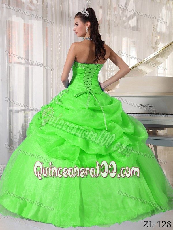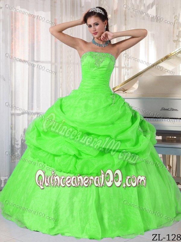 Neckline : StraplessShown Color : Spring GreenSilhouette : Ball GownsSleeve Length : sleevelessBack Detail : Lace upFabric : OrganzaEmbellishment : AppliquesOccasion : Prom,Military Ball,Sweet 16,QuinceaneraSeason : Spring,Summer,Fall,Winter
