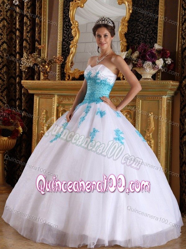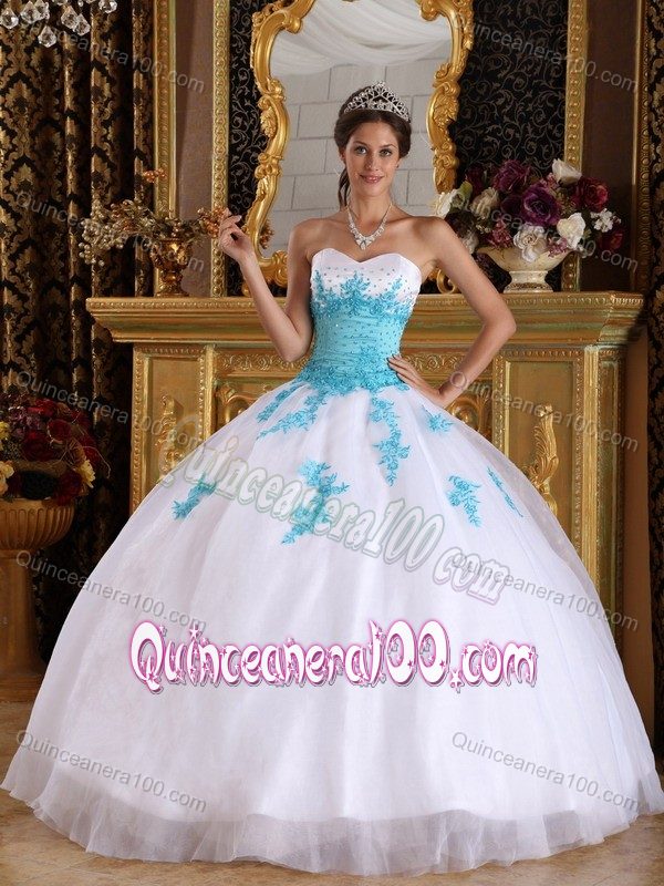 Neckline : SweetheartShown Color : WhiteSilhouette : Ball GownsSleeve Length : sleevelessHemline : floor lengthBack Detail : ZipperFabric : OrganzaEmbellishment : Beading,AppliquesOccasion : Prom,Sweet 16,QuinceaneraSeason : Spring,Summer,Fall,Winter