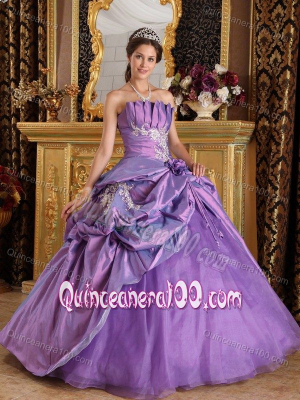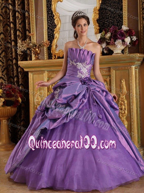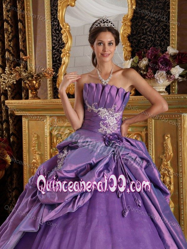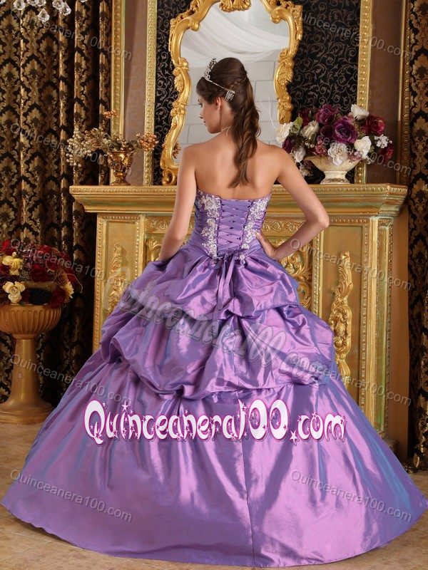 Neckline : StraplessShown Color : LavenderSilhouette : Ball GownsSleeve Length : sleevelessBack Detail : Lace upFabric : TaffetaEmbellishment : Appliques,Ruching,Pick UpsOccasion : Prom,Military Ball,Sweet 16,QuinceaneraSeason : Spring,Summer,Fall,Winter