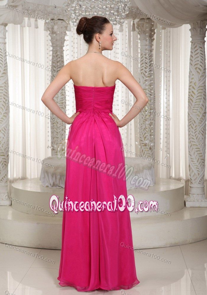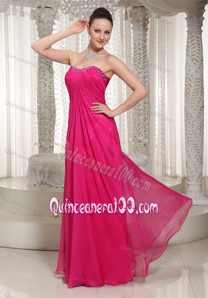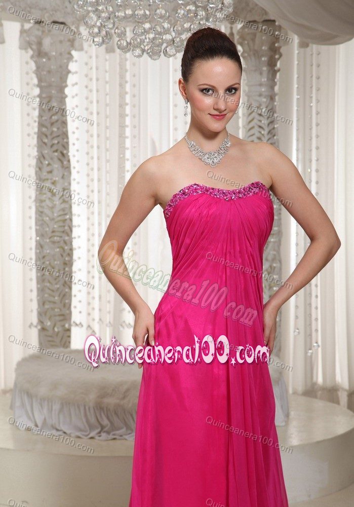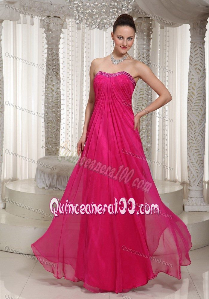Neckline : StraplessShown Color : Hot PinkSilhouette : EmpireSleeve Length : sleevelessHemline : floor lengthBack Detail : ZipperFabric : ChiffonEmbellishment : Beading,RuchingOccasion : Sweet 16,QuinceaneraSeason : Spring,Summer,Fall,Winter