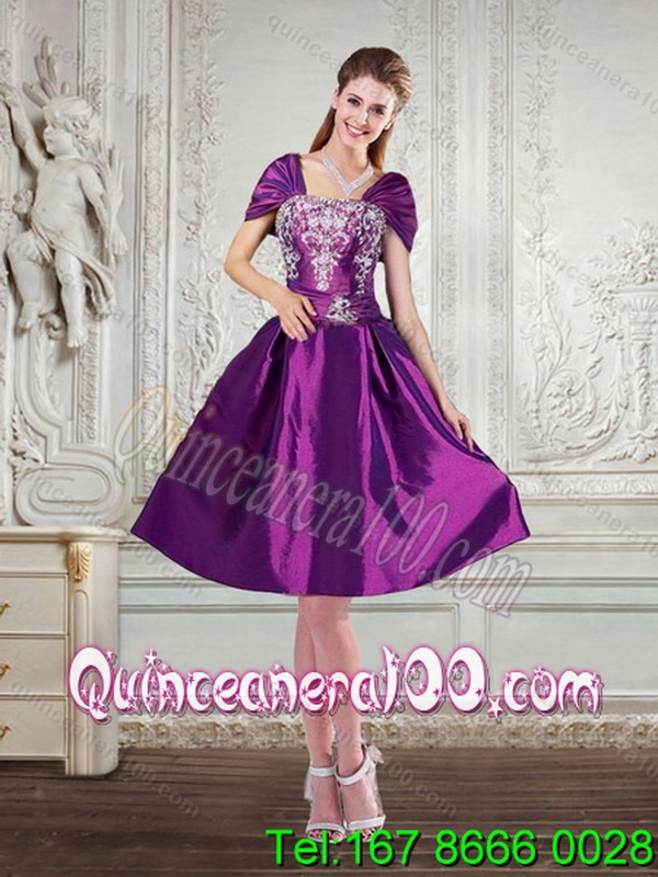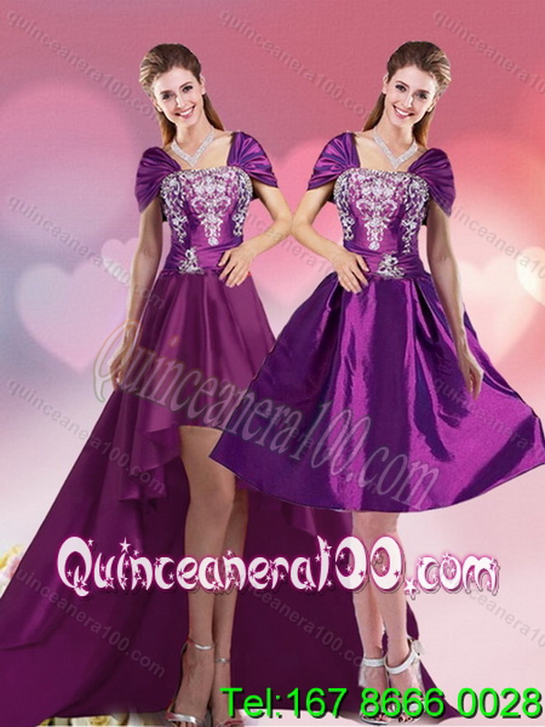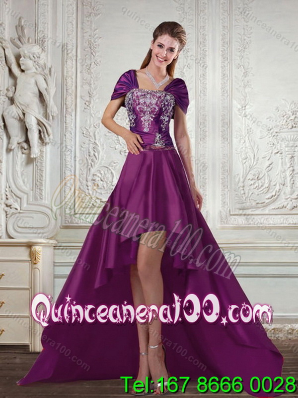 Neckline : SquareShown Color : PurpleSilhouette : A-lineSleeve Length : cap sleevesHemline : high lowBack Detail : Lace upFabric : TaffetaEmbellishment : EmbroideryOccasion : Military Ball,Sweet 16,QuinceaneraSeason : Spring,Summer,Fall