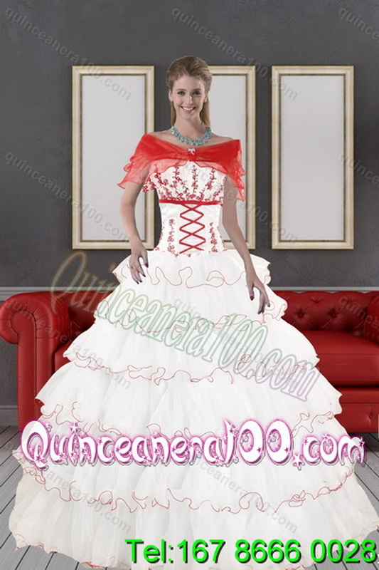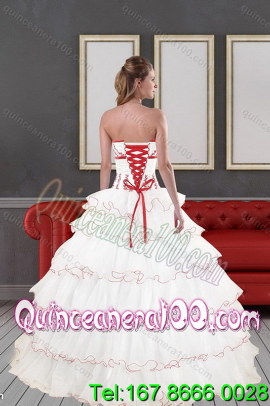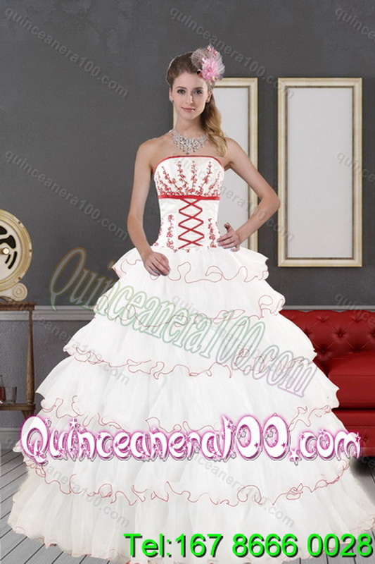 Neckline : StraplessShown Color : White And RedSilhouette : Ball GownsSleeve Length : sleevelessHemline : floor lengthBack Detail : Lace upFabric : OrganzaEmbellishment : Appliques,Ruffled LayersOccasion : Military Ball,Sweet 16,QuinceaneraSeason : Spring,Summer,Fall,Winter