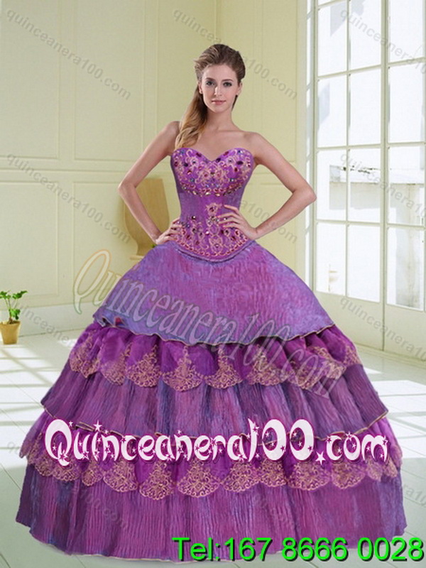Neckline : SweetheartShown Color : PurpleSilhouette : Ball GownsSleeve Length : sleevelessHemline : floor lengthBack Detail : Lace upFabric : Organza,SequinedEmbellishment : Beading,Ruffled LayersOccasion : Military Ball,Sweet 16,QuinceaneraSeason : Spring,Summer,Fall,Winter