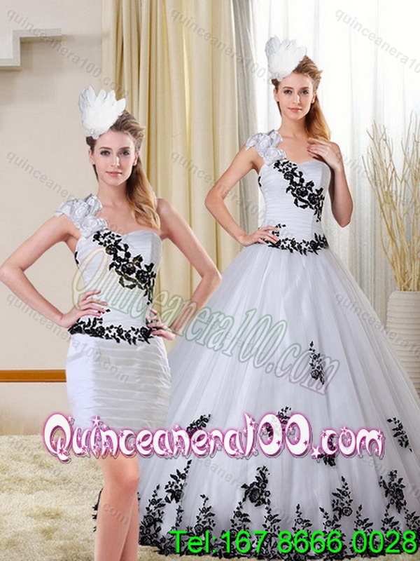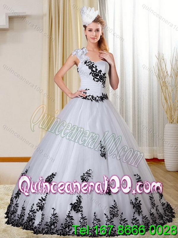 Neckline : One shoulder Shown Color : White And Black Silhouette : Ball Gowns Sleeve Length : sleeveless Hemline : floor length Back Detail : Lace up Fabric : Organza Embellishment : Appliques Occasion : Military Ball,Sweet 16,Quinceanera Season : Spring,Summer,Fall,Winter