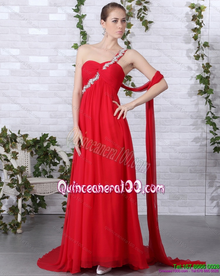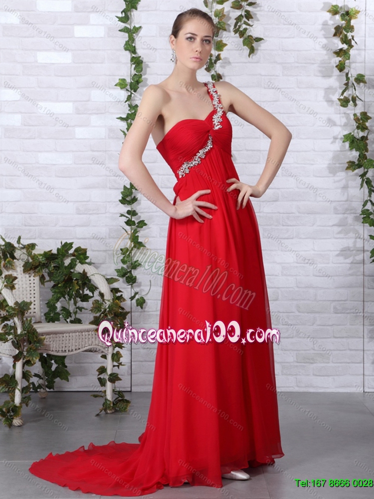 Neckline : One shoulderShown Color : RedSilhouette : EmpireSleeve Length : sleevelessHemline : with trainBack Detail : ZipperFabric : ChiffonEmbellishment : Beading,RuchingOccasion : Prom,PartySeason : Spring,Summer,Fall,Winter