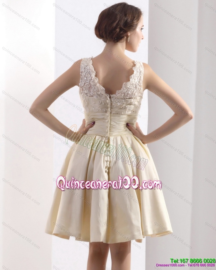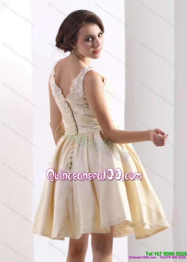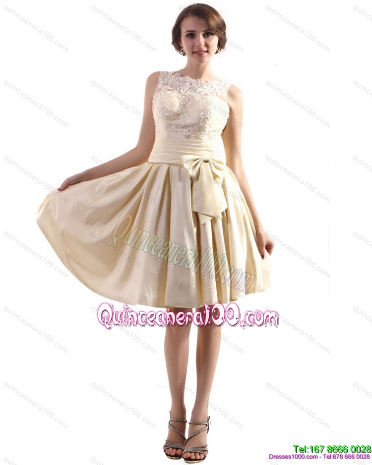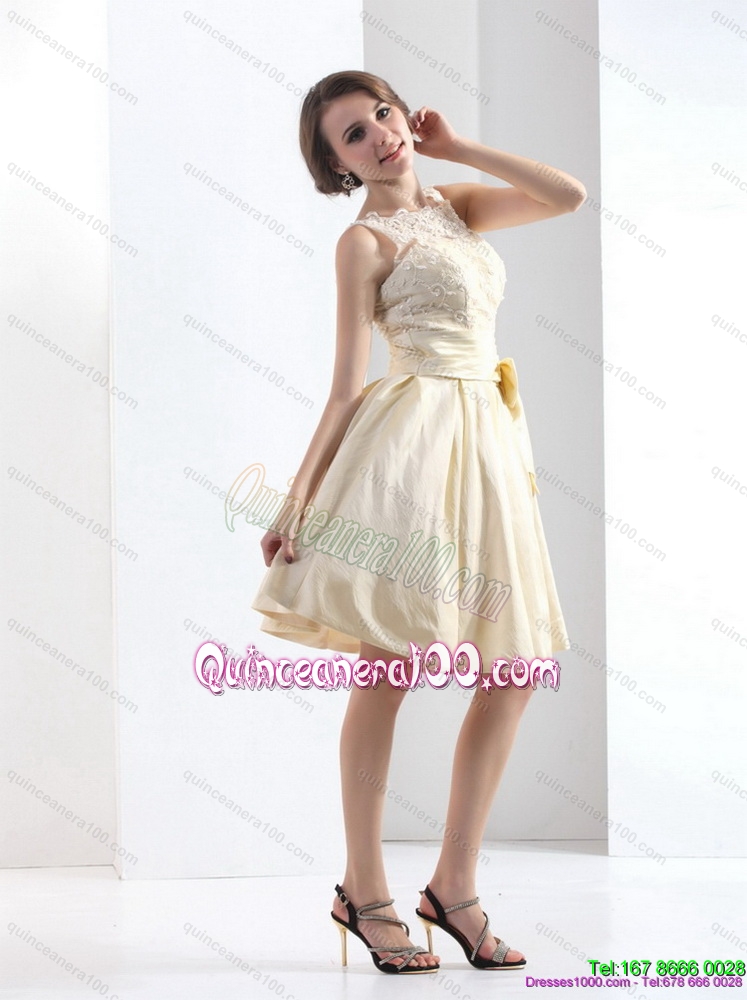 Neckline : High-neckShown Color : ChampagneSilhouette : A-lineSleeve Length : sleevelessHemline : mini lengthBack Detail : ZipperFabric : TaffetaEmbellishment : Ruching,BowknotOccasion : Prom,PartySeason : Spring,Summer,Fall