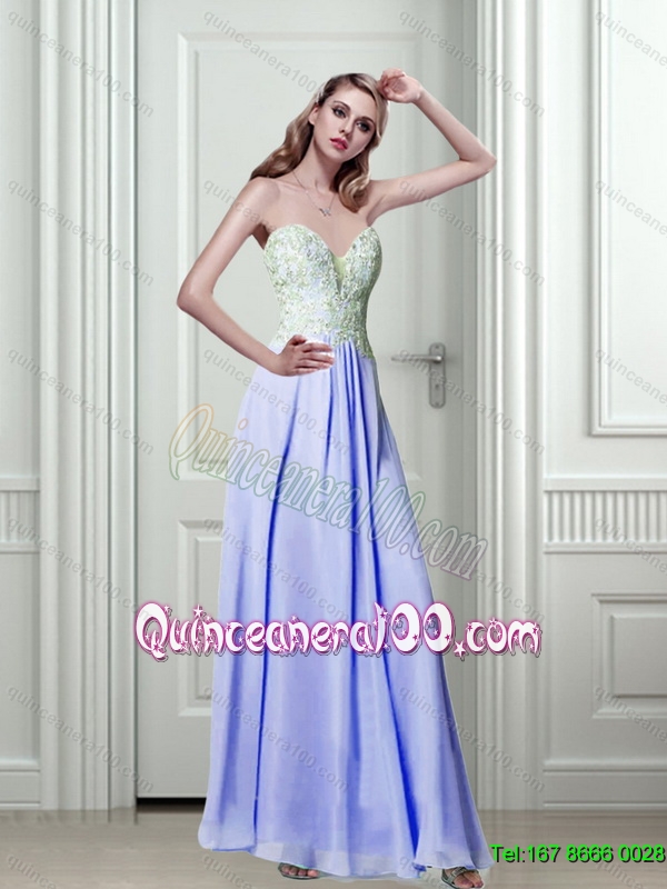 Neckline : SweetheartShown Color : LavenderSilhouette : EmpireSleeve Length : sleevelessHemline : floor lengthBack Detail : Side zipperFabric : ChiffonEmbellishment : AppliquesOccasion : Prom,Party,Wedding PartySeason : Spring,Summer,Fall,Winter