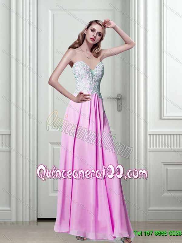 Neckline : SweetheartShown Color : Baby PinkSilhouette : EmpireSleeve Length : sleevelessHemline : floor lengthBack Detail : Side zipperFabric : ChiffonEmbellishment : AppliquesOccasion : Prom,PartySeason : Spring,Summer,Fall,Winter