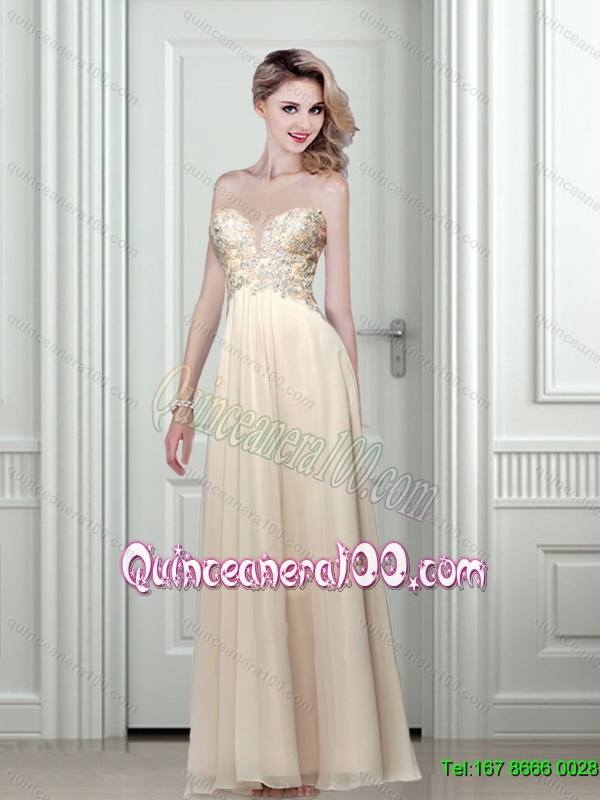 Neckline : SweetheartShown Color : ChampagneSilhouette : Column/SheathSleeve Length : sleevelessHemline : floor lengthBack Detail : Side zipperFabric : ChiffonEmbellishment : AppliquesOccasion : Prom,PartySeason : Spring,Summer,Fall,Winter