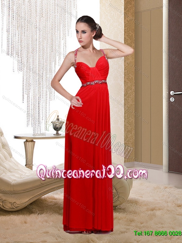Neckline : Halter topShown Color : RedSilhouette : EmpireSleeve Length : sleevelessHemline : floor lengthBack Detail : Criss crossFabric : ChiffonEmbellishment : Beading,RuchingOccasion : Prom,PartySeason : Spring,Summer,Fall,Winter