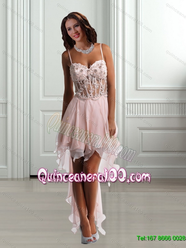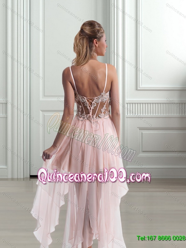 Neckline : Spaghetti strapsShown Color : Baby PinkSilhouette : EmpireSleeve Length : sleevelessHemline : high lowBack Detail : Lace upFabric : OrganzaEmbellishment : AppliquesOccasion : Prom,PartySeason : Spring,Summer,Fall,Winter