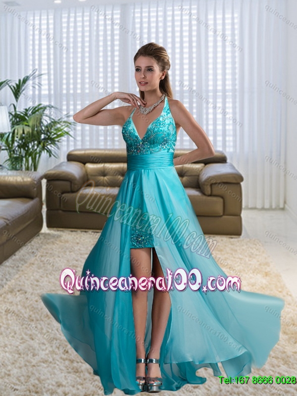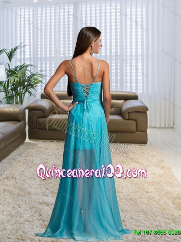 Neckline : V-neckShown Color : TealSilhouette : EmpireSleeve Length : sleevelessHemline : with trainBack Detail : Lace upFabric : OrganzaEmbellishment : BeltOccasion : Prom,PartySeason : Spring,Summer,Fall,Winter