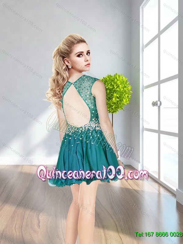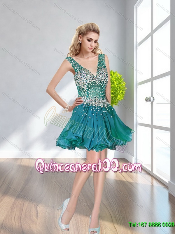 Neckline : V-neckShown Color : TurquoiseSilhouette : ShortSleeve Length : sleevelessHemline : mini lengthBack Detail : BacklessFabric : ChiffonEmbellishment : SequinsOccasion : Prom,PartySeason : Spring,Summer,Fall