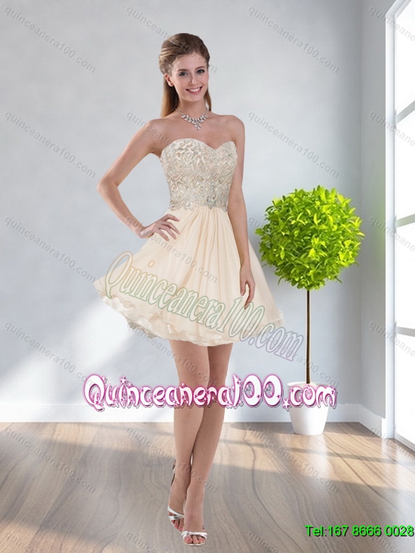 Neckline : SweetheartShown Color : ChampagneSilhouette : ShortSleeve Length : sleevelessHemline : mini lengthBack Detail : ZipperFabric : ChiffonEmbellishment : AppliquesOccasion : Prom,PartySeason : Spring,Summer,Fall