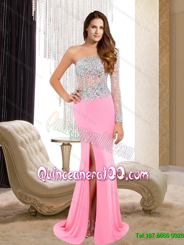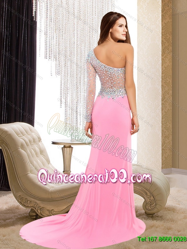 Neckline : One shoulderShown Color : PinkSilhouette : Column/SheathSleeve Length : long sleevesHemline : with trainBack Detail : BacklessFabric : TaffetaEmbellishment : BeadingOccasion : Prom,Party,Military BallSeason : Spring,Summer,Fall,Winter