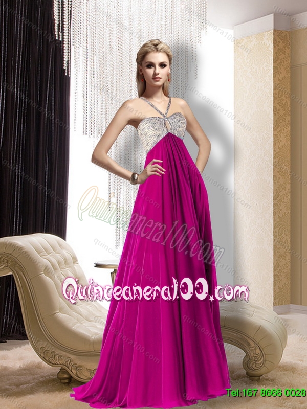 Neckline : Halter topShown Color : FuchsiaSilhouette : EmpireSleeve Length : sleevelessHemline : floor lengthBack Detail : ZipperFabric : ChiffonEmbellishment : Beading,RuchingOccasion : Prom,Party,Military BallSeason : Spring,Summer,Fall,Winter