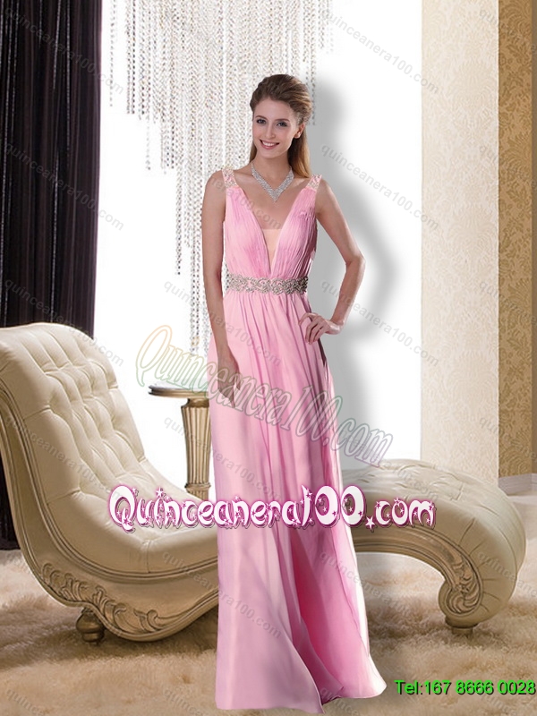 Neckline : V-neckShown Color : Rose PinkSilhouette : EmpireSleeve Length : sleevelessHemline : floor lengthBack Detail : Criss crossFabric : ChiffonEmbellishment : Beading,RuchingOccasion : Prom,Party,Military BallSeason : Spring,Summer,Fall,Winter