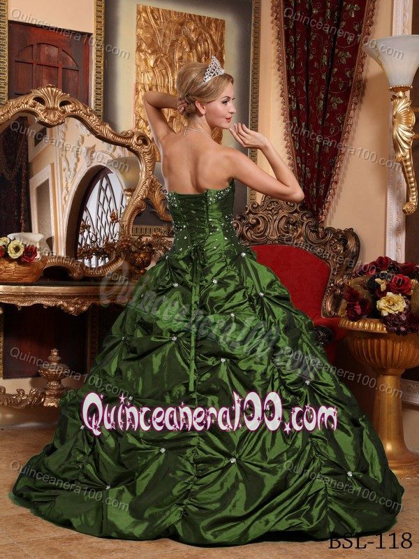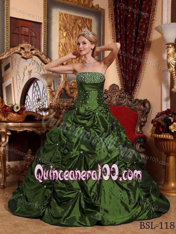 Neckline : StraplessShown Color : Olive GreenSilhouette : A-lineSleeve Length : sleevelessBack Detail : Lace upEmbellishment : BeadingOccasion : Sweet 16,QuinceaneraSeason : Spring,Summer,Fall,Winter