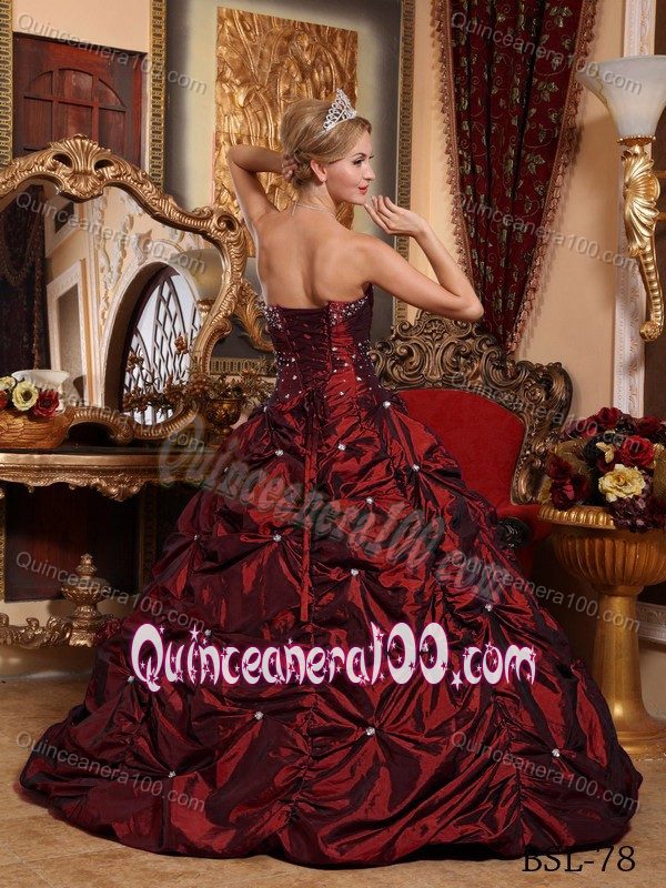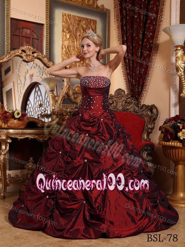 Neckline : StraplessShown Color : Red,Wine RedSilhouette : A-lineSleeve Length : sleevelessBack Detail : Lace upFabric : TaffetaEmbellishment : BeadingOccasion : Sweet 16,QuinceaneraSeason : Spring,Summer,Fall,Winter