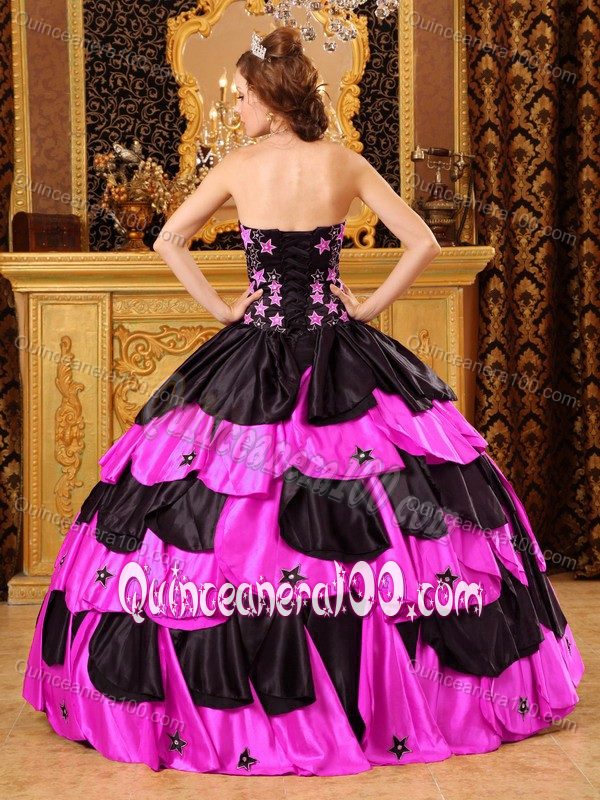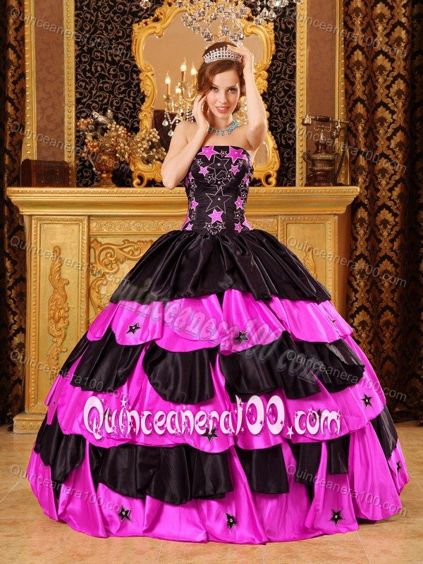 Neckline : StraplessShown Color : Pink And BlackSilhouette : Ball GownsSleeve Length : sleevelessBack Detail : Lace upFabric : TaffetaEmbellishment : Embroidery,Ruffled LayersOccasion : Sweet 16,QuinceaneraSeason : Spring,Summer,Fall,Winter