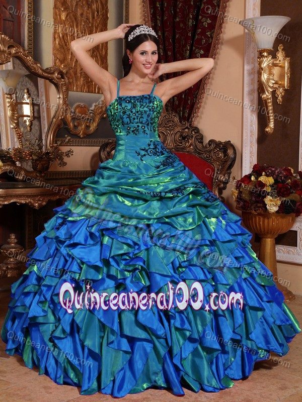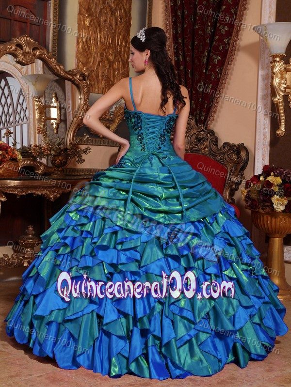 Neckline : Spaghetti strapsShown Color : BlueSilhouette : Ball GownsSleeve Length : sleevelessHemline : floor lengthBack Detail : Lace upFabric : SatinEmbellishment : Appliques,RufflesOccasion : Sweet 16,QuinceaneraSeason : Spring,Summer,Fall,Winter