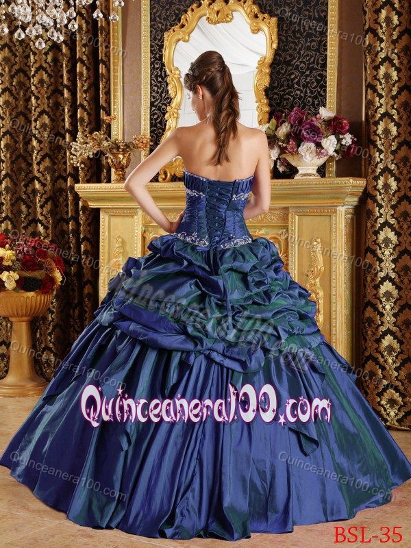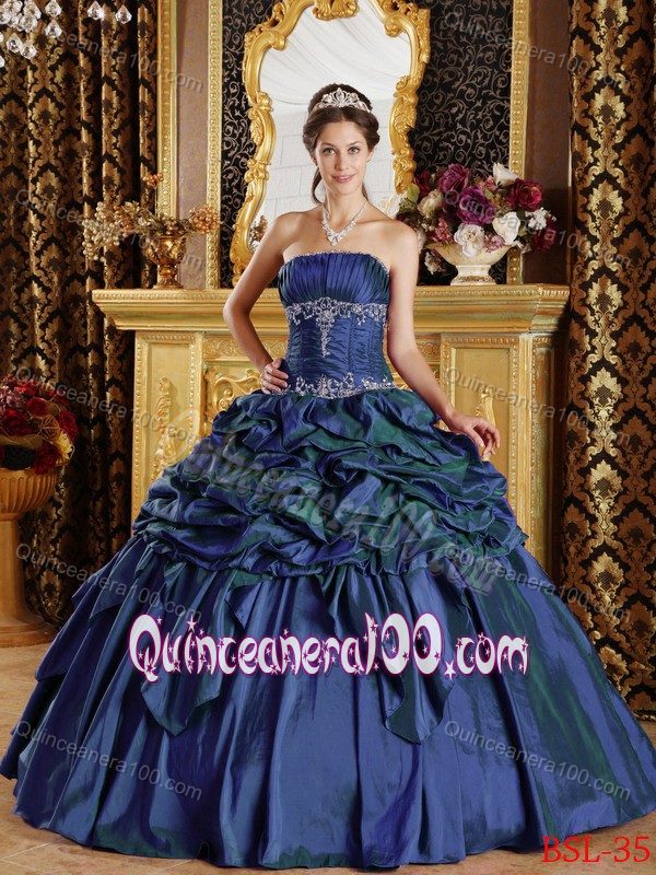 Neckline : StraplessShown Color : Navy BlueSilhouette : A-lineSleeve Length : sleevelessBack Detail : Lace upFabric : TaffetaEmbellishment : AppliquesOccasion : Sweet 16,QuinceaneraSeason : Spring,Summer,Fall,Winter