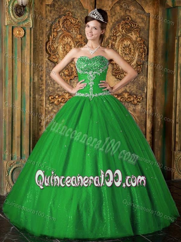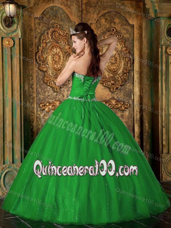 Neckline : StraplessShown Color : GreenSilhouette : A-lineSleeve Length : sleevelessBack Detail : Lace upFabric : TulleEmbellishment : Beading,AppliquesOccasion : Sweet 16,QuinceaneraSeason : Spring,Summer,Fall,Winter