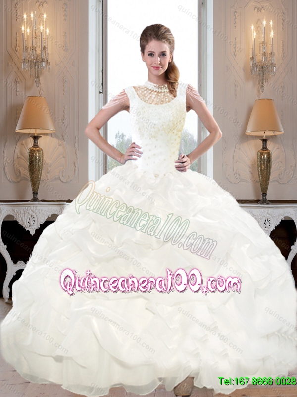 Neckline : High-neckShown Color : WhiteSilhouette : Ball GownsSleeve Length : cap sleevesHemline : floor lengthBack Detail : ZipperFabric : TaffetaEmbellishment : Beading,Pick UpsOccasion : Military Ball,Sweet 16,QuinceaneraSeason : Spring,Summer,Fall,Winter
