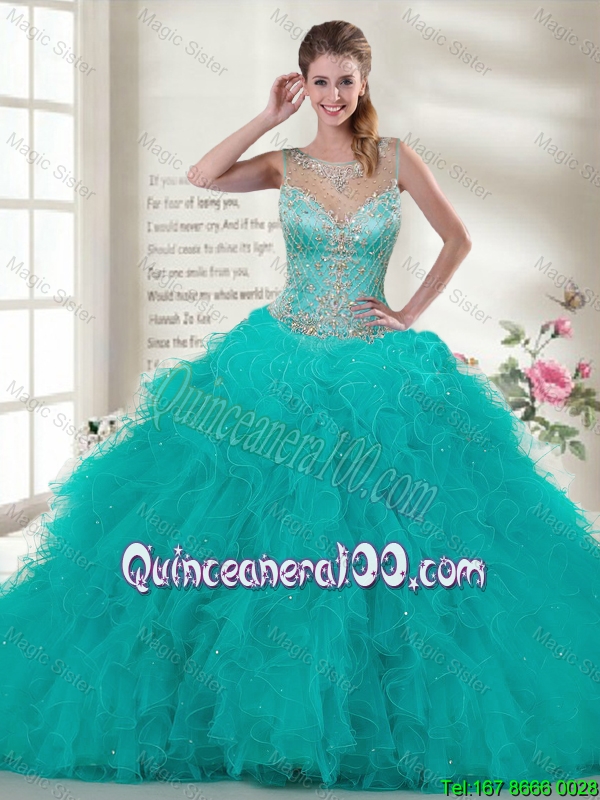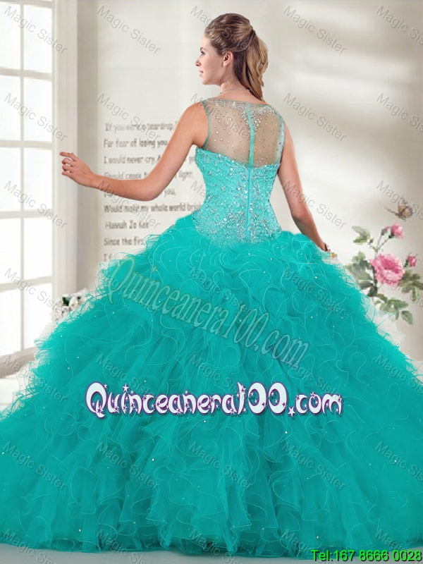 Neckline : ScoopShown Color : TealSilhouette : Ball GownsSleeve Length : sleevelessHemline : floor lengthBack Detail : ZipperFabric : OrganzaEmbellishment : Beading,RufflesOccasion : Military Ball,Sweet 16,QuinceaneraSeason : Spring,Summer,Fall,Winter