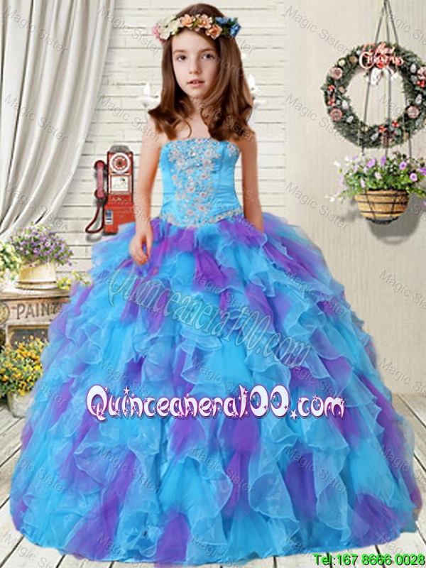 Neckline : StraplessShown Color : Multi-colorSilhouette : Ball GownsSleeve Length : sleevelessHemline : floor lengthBack Detail : Lace upFabric : OrganzaEmbellishment : Appliques,RufflesOccasion : Wedding PartySeason : Spring,Summer,Fall,Winter