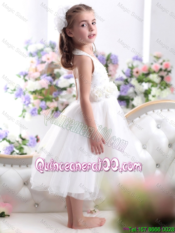 Cute Halter Top White Mini Length Mini Quinceanera Dresses with Hand Made Flower