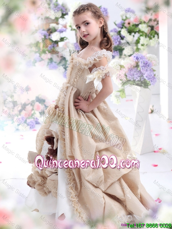 Neckline : Spaghetti strapsShown Color : ChampagneSilhouette : A-lineSleeve Length : sleevelessHemline : floor lengthBack Detail : Clasp handleFabric : OrganzaEmbellishment : Ruffles,Hand Made FlowerOccasion : Wedding PartySeason : Spring,Summer,Fall,Winter