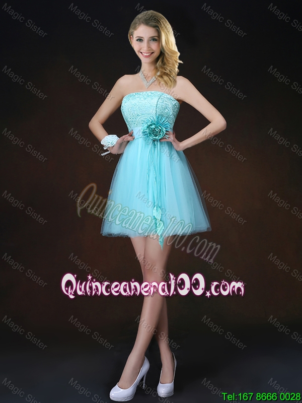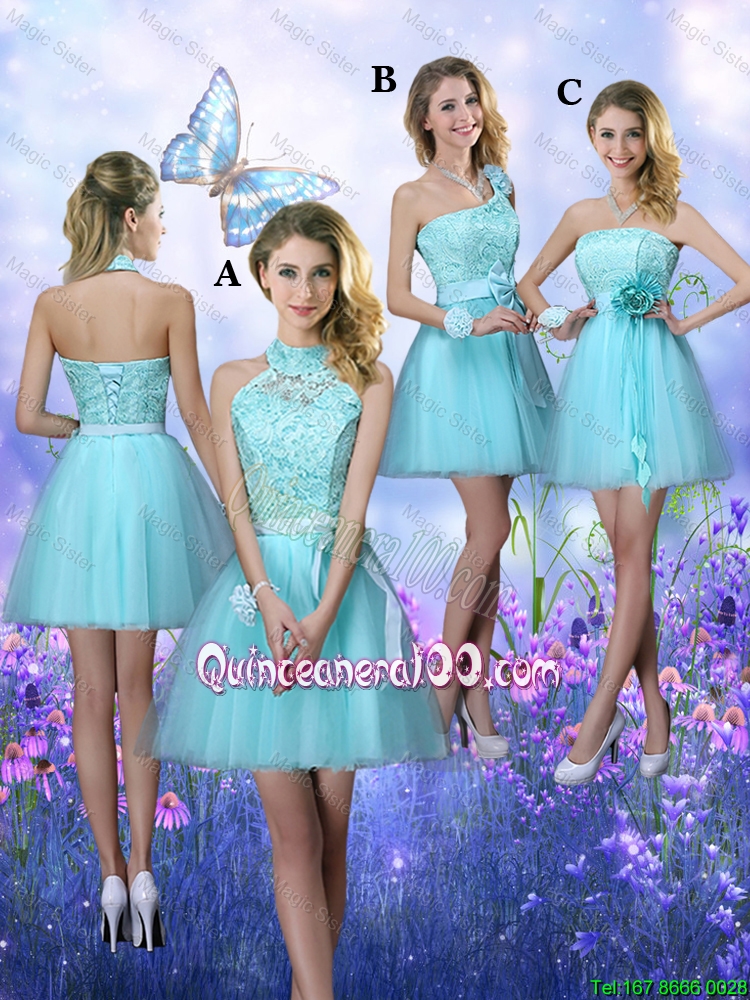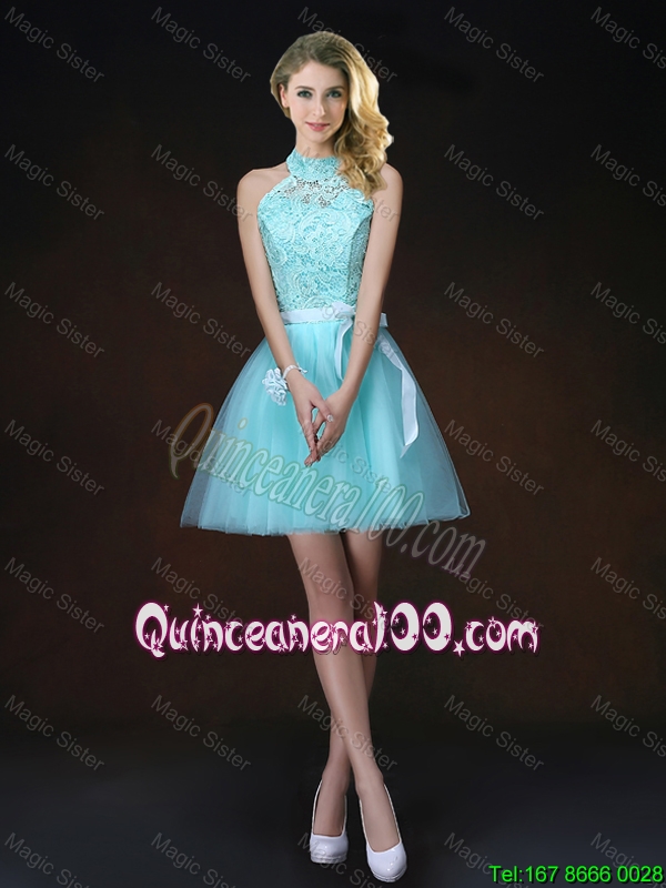 Neckline : Halter top Shown Color : Aqua Blue Silhouette : A-line Sleeve Length : sleeveless Hemline : knee length Back Detail : Lace up Fabric : Tulle Embellishment : Lace,Appliques,Bowknot Occasion : Prom,Party,Wedding Party Season : Spring,Summer,Fall