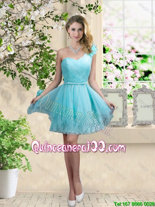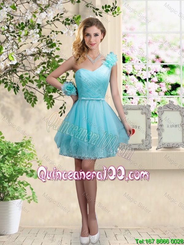 Neckline : One shoulder Shown Color : Aqua Blue Sleeve Length : sleeveless Hemline : mini length Back Detail : Zipper Fabric : Tulle Embellishment : Belt,Hand Made Flower Occasion : Prom,Party,Wedding Party Season : Spring,Summer
