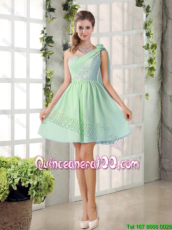 Neckline : One shoulder Shown Color : Apple Green Sleeve Length : sleeveless Hemline : mini length Back Detail : Lace up Fabric : Chiffon Embellishment : Lace,Hand Made Flower Occasion : Prom,Party,Wedding Party Season : Spring,Summer,Fall
