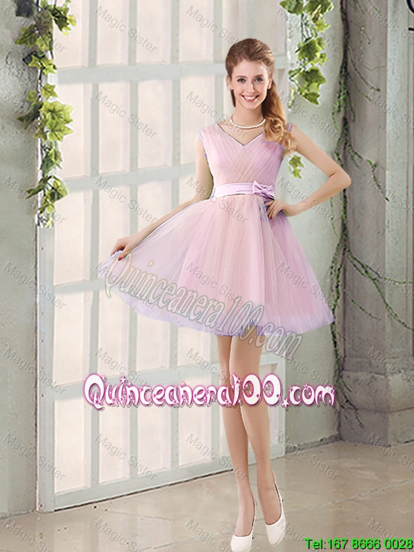 Neckline : V-neckShown Color : Rose PinkSilhouette : A-lineSleeve Length : sleevelessHemline : mini lengthBack Detail : Lace upFabric : TulleEmbellishment : Ruching,Bowknot,BeltOccasion : Prom,Party,Wedding PartySeason : Spring,Summer,Fall
