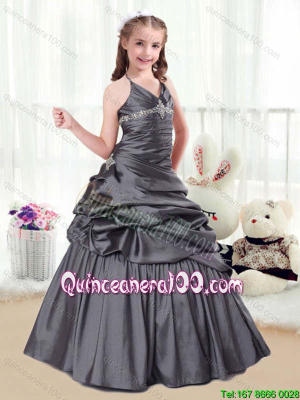 Neckline : Halter topShown Color : GreySilhouette : A-lineSleeve Length : sleevelessHemline : floor lengthBack Detail : Lace upFabric : TaffetaEmbellishment : Beading,Pick UpsOccasion : Quinceanera,Wedding PartySeason : Spring,Summer,Fall,Winter