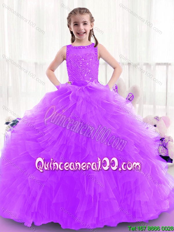 Neckline : BateauShown Color : PurpleSilhouette : Ball GownsSleeve Length : sleevelessHemline : floor lengthBack Detail : ZipperFabric : TulleEmbellishment : Beading,RufflesOccasion : Quinceanera,Wedding PartySeason : Spring,Summer,Fall,Winter