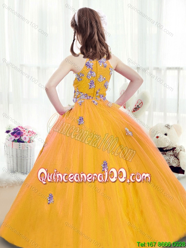 Neckline : High-neckShown Color : GoldSilhouette : Ball GownsSleeve Length : sleevelessHemline : floor lengthBack Detail : ZipperFabric : TulleEmbellishment : Beading,AppliquesOccasion : Quinceanera,Wedding PartySeason : Spring,Summer,Fall,Winter